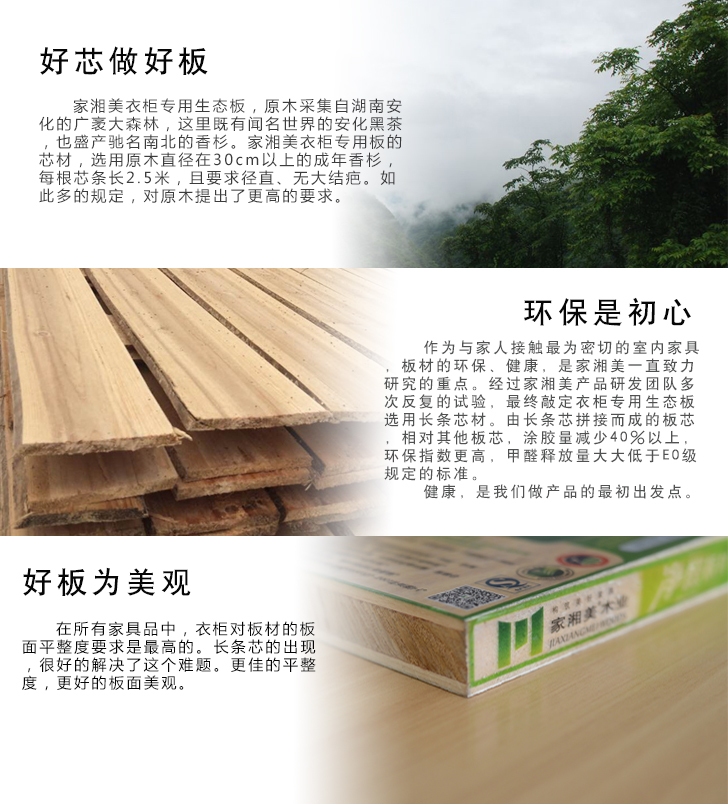 藏于芯,斂于型。家湘美衣柜專用生態(tài)板,我們沒有追求所謂的一板多用,回歸板材初心,只求簡簡單單做衣柜,做好衣柜,做健康靈性的環(huán)保衣柜。