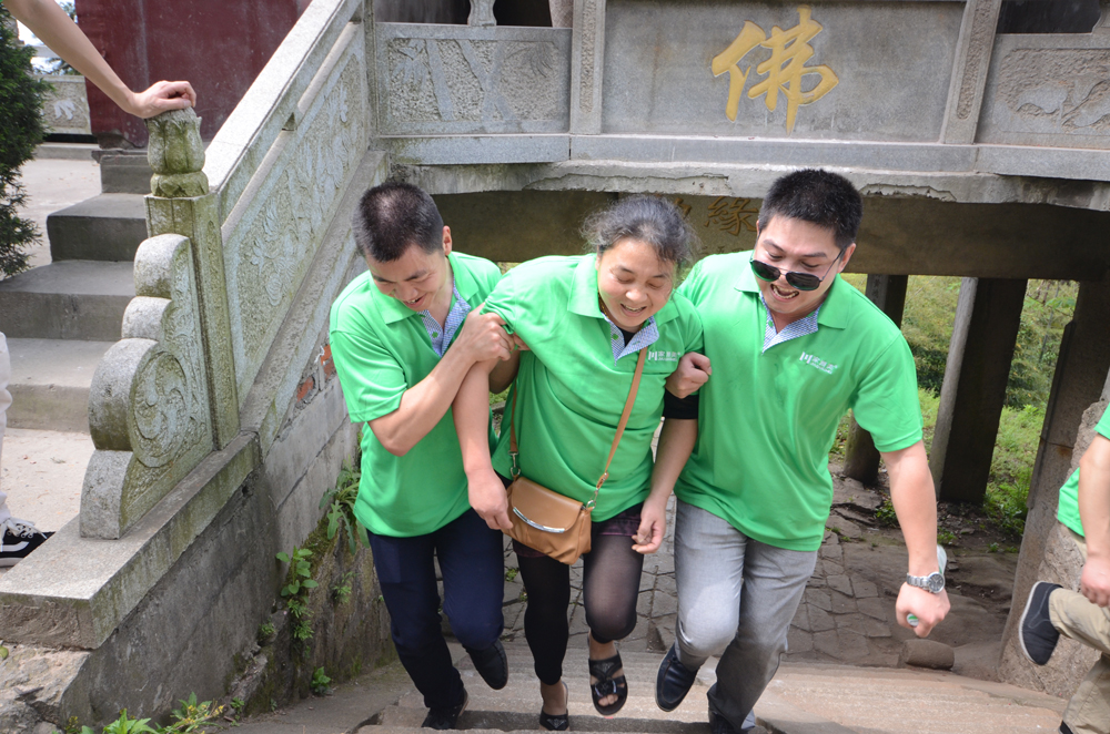 終于,在通向山頂的最后300米處,阿姨們不堪重負,有心通山頂卻無力前行。這時候,家湘美的小伙子們將團隊不拋棄不放棄的精神及時體現了出來。兩兩協作扶著、撐著甚至是架著阿姨前行。原本可輕松奪冠的“快樂隊”隊長,放棄了提前到達山頂的機會,主動停下來協助阿姨登頂。